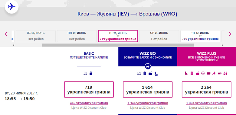Первый перелет Киев – Вроцлав. 20 июня. Для членов wizzair-клуба – 17 евро, для рядовых пассажиров – 27 евро.