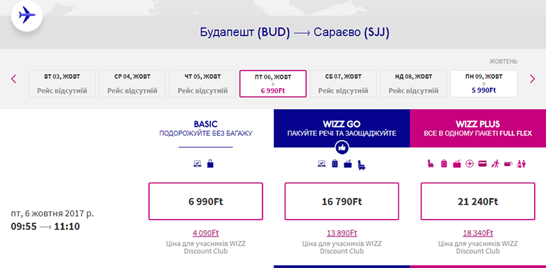 Для примера, предлагаем даты – 6-10 октября. Цена – €45 в обе стороны. Цена действительна для членов Wizz Discount Club. Все остальные могут купить билеты за €65 (туда-обратно).