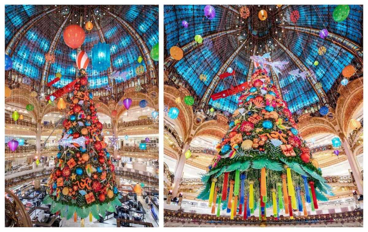Щороку всередині універмагу Galeries Lafayette встановлюють чотириповерхову різдвяну ялинку, яка завжди має іншу тему. Тема цього року – «Рушайте в різдвяну подорож.” Дерево увінчане куполом і прикрашене орнаментами – від вишитих дрібничок до барвистих іграшок, які нагадують про багатство культур світу. Навколо дерева зі скляної стелі звисають прикраси у вигляді повітряних куль і великий іграшковий літачок. За традицією в Galeries Lafayette вітрини магазину прикрашені приголомшливими автоматами на ту ж тему.