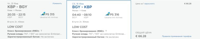 Первый этап перелета – Киев – Милан, 31 января- 16 февраля – 66 евро (МАУ). Есть выбор дат. В Милан также можно добраться а/к Эрнест из Львова, Киева.