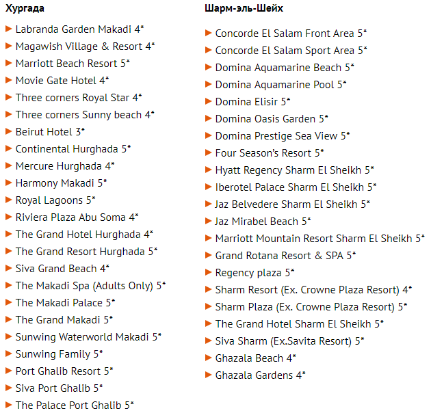 Список отелей Египта, которые не требуют обязательной оплаты за новогодний праздничный ужин. Список составлен туроператорами по направлению.