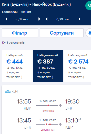 Київ — Нью-Йорк, 19-29 лютого — €387