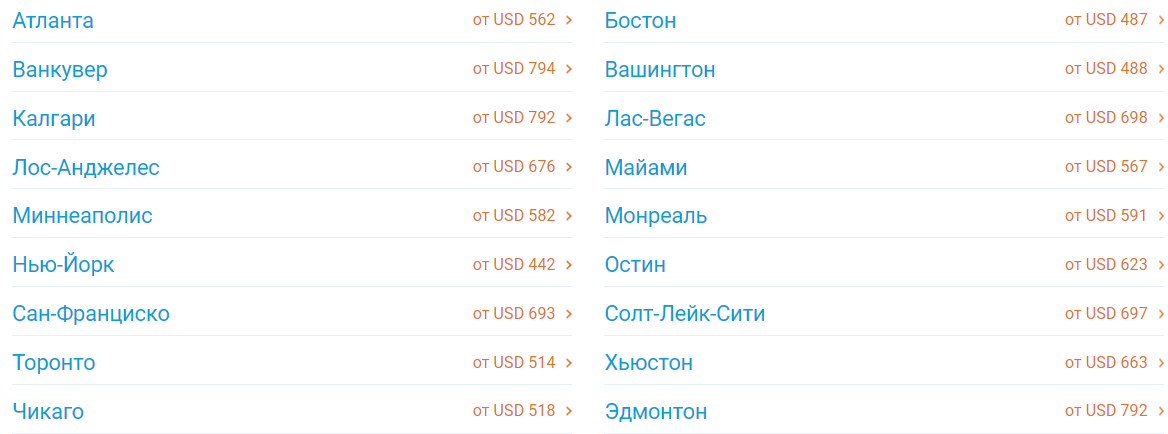 - в Америку – Бостон, Вашингтон, Торонто, Нью-Йорк, Сан-Франціско, Монреаль, Атланта, Майамі, Чикаго, Ванкувер, Мехико та ін.