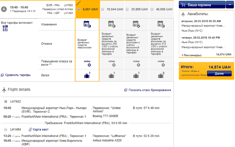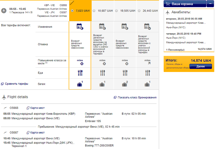 Для примера предлагаем перелет из Киева в Нью-Йорк и обратно на даты 20-29 марта. Стоимость билетов в обе стороны составит ₴14574 или €416. В стоимость включен провоз багажа весом до 23 кг. Перелет в США осуществляется через Вену с ожиданием 2 ч. 45 мин в столице Австрии. Из Нью-Йорка в Киев летим через Франкфурт (ожидание – 4 ч. 5 мин.).