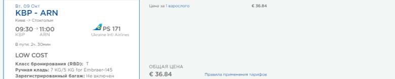 Київ – Стокгольм, 9 листопада – 36,8 євро (у вартість закладена ручна кладь до 7 кг)