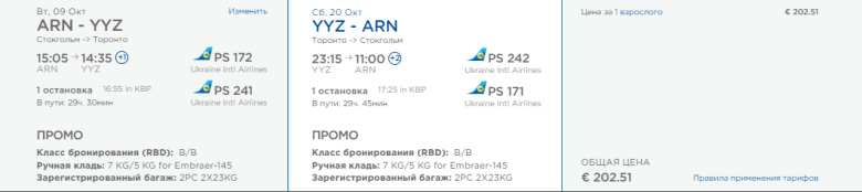 Стокгольм – Торонто – Стокгольм, 6-17 листопада – 202,5 євро (ручна кладь 7 кг, багаж 2х23 кг). По дорозі у Стокгольм на зворотному шляху можна вийти з літака у Києві, попередньо подбавши, щоб багаж зареєстрували до Борисполя.