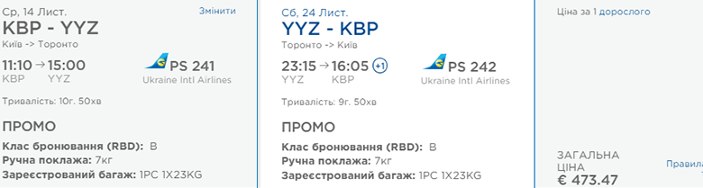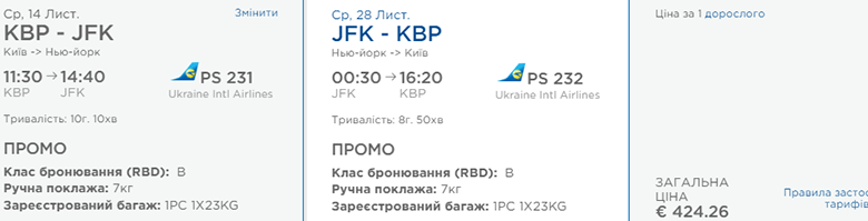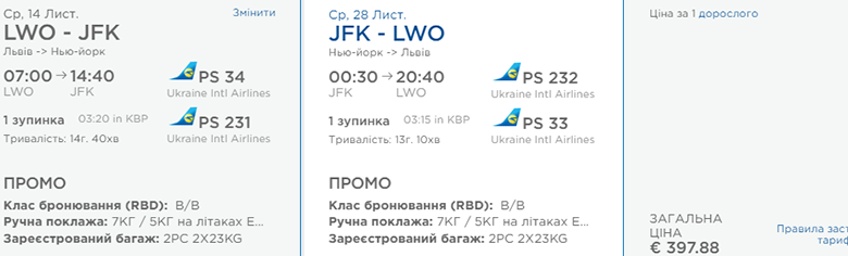 Период путешествия – 14-24 ноября. За билеты туда-обратно придется заплатить €398. Летим с остановкой в Киеве. Подождать в столице по дороге в Америку придется 3 ч. 20 мин., на обратном пути – 3 ч. 15 мин.