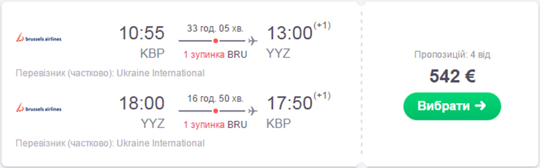 С 7 по 17 сентября действует тариф 542 евро из Киева до Торонто. Рейсы осуществляют МАУ + Брюссельские авиалинии (с пересадкой в Брюсселе).