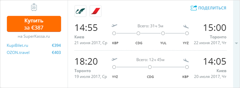 Переліт туди – через Париж (час очікування – 1 год. 15 хв.) та Монреаль (17 год. 50 хв.). Назад – через Париж (2 год. 10 хв.). Ціна може змінитися, поспішайте!