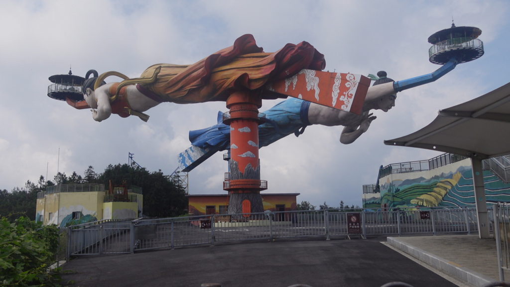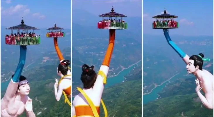 В 2020 році поблизу Чунціна був відкритий атракціон «Летючий поцілунок» (Flying Kiss). З однієї сторони, він унікальний за своїми параметрами. Статуї «Принц» та «Фея» мають висоту 52 метри і сам комплекс побудований на краю 1200-метрової скелі. Багато хто вважає Flying Kiss милим і романтичним. Але він же був визнаний однією із найпотворніших споруд у Китаї 2020 року. Дивиться самі. А ще подумайте, як люди потрапляють на ці площадки.