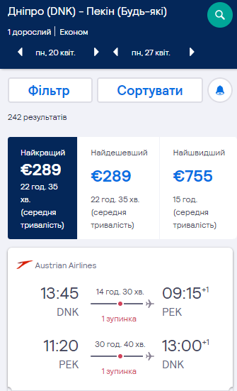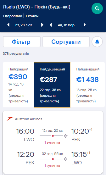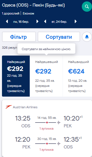 Одеса — Пекін. Дати: 9-17 березня. Вартість квитків у два боки — €292