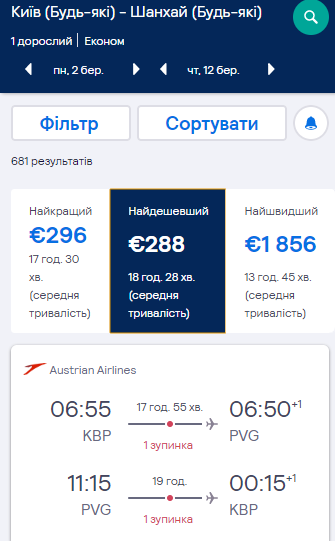 Львів — Шанхай. Дати: 9-17 березня. Вартість квитків у два боки — €288