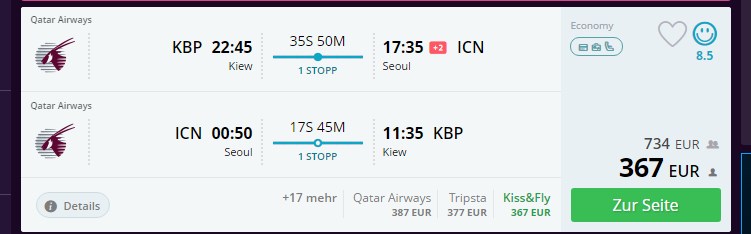 Київ – Сеул, 11-22 листопада, €367 у два боки.