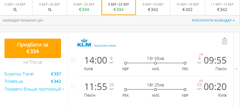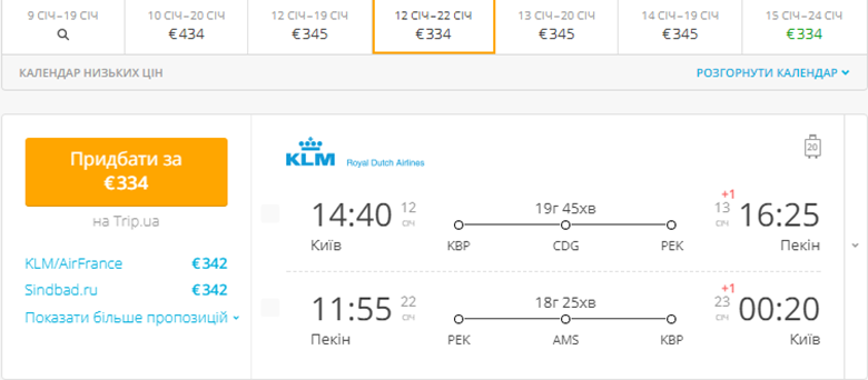 Летим из Киева в Пекин и обратно на крыльях авиакомпании KLM. Цена билета туда-обратно составит €334. В цену входит провоз багажа весом до 20 кг и ручная кладь. Дат много. Для примера предлагаем даты – 12-22 января и 8-22 марта.
