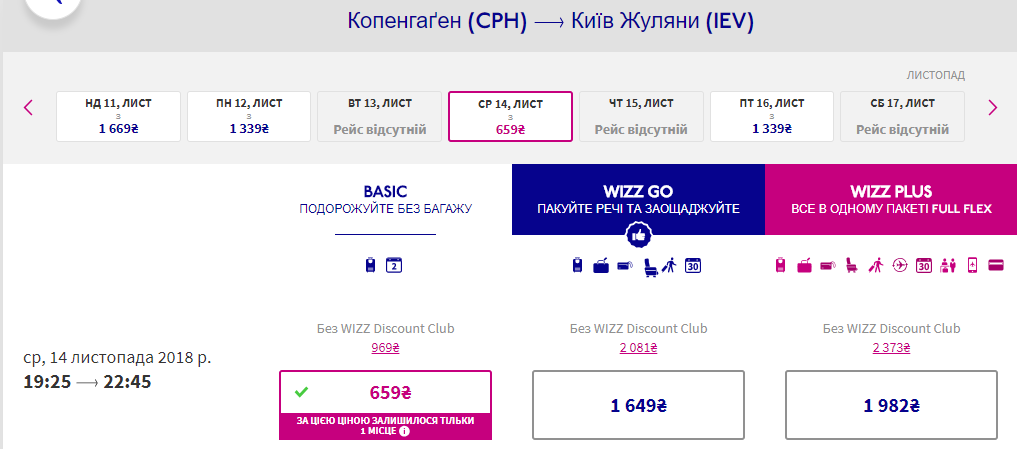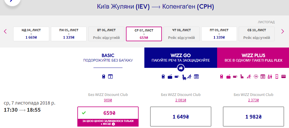 Київ-Копенгаген 7-14 листопада 42 євро для учасників Wizz Club та 62 євро для всіх пасажирів.