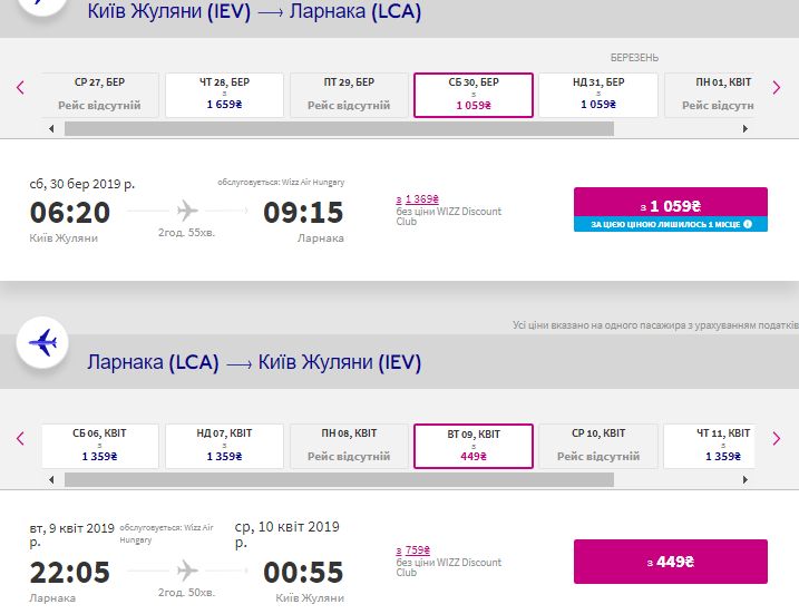 Київ – Ларнака, 31 березня-9 квітня – 48 євро для учасників Wizz club та 68 євро для інших пасажирів