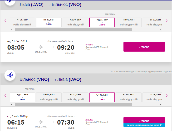 Львів – Вільнюс, 31 березня-4 квітня – 17 євро для учасників Wizz club та 29 євро для інших пасажирів