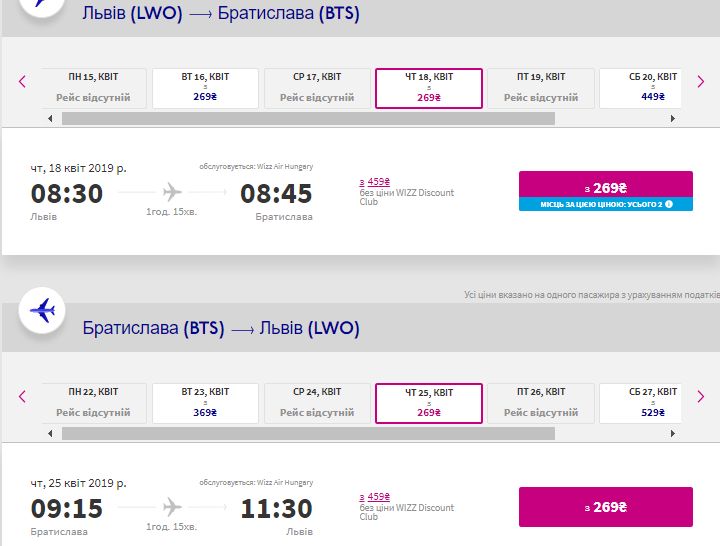 Львів – Братислава, 18-25 квітня – 17 євро для учасників Wizz club та 29 євро для інших пасажирів