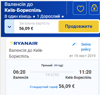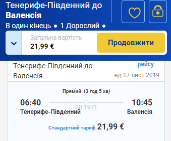 Тенеріфе – Валенсія, 17 листопада – 22 євро