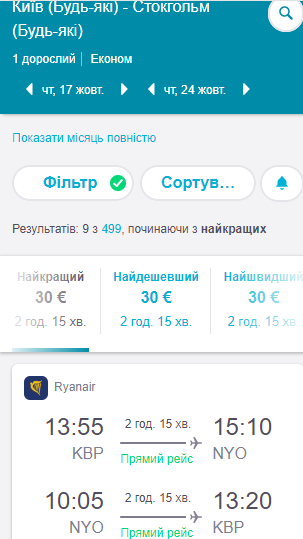 Акція Ryanair: 50 000 квитків зі знижкою 20%. Ціни з України – від €10 в один бік. Період акції: 19 липня. Період подорожей: вересень – листопад.
