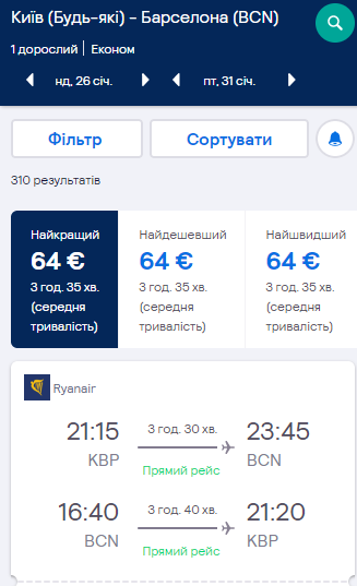 Київ — Барселона, 26-31 січня — €64