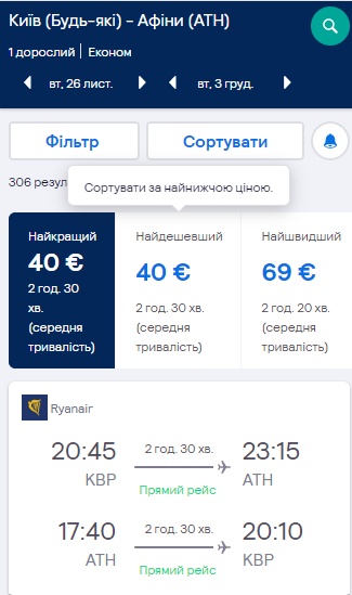 Київ — Афіни, 26 листопада-3 грудня — €40