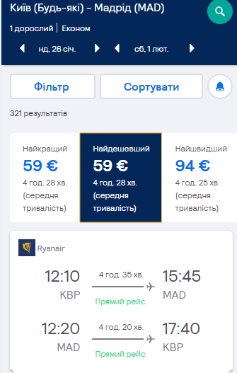 Київ — Мадрид, 26 січня – 1 лютого — €59