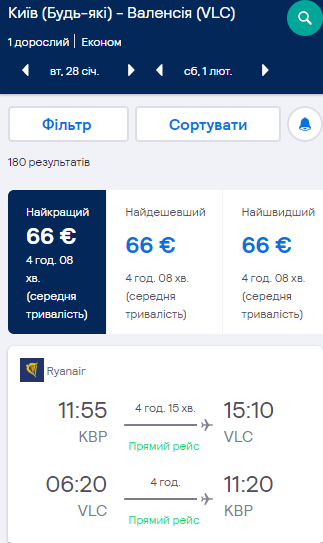 Київ — Валенсія, 26 січня -1 лютого — €66