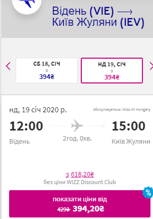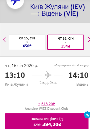 Київ — Відень, 16-19 січня — €28 для учасників wizz-клубу та €44 для всіх інших
