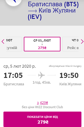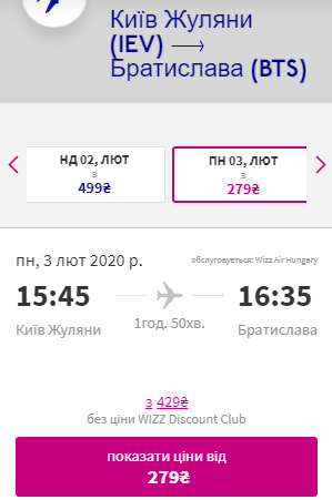Київ — Братислава, 3-5 лютого — €20 для учасників wizz-клубу та €41 для всіх інших