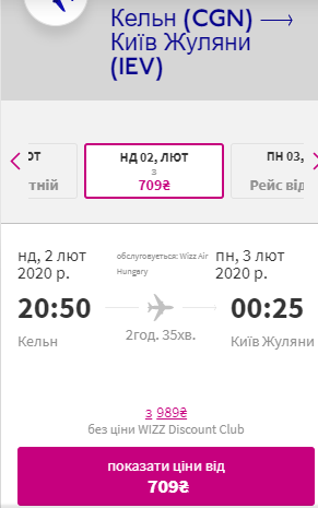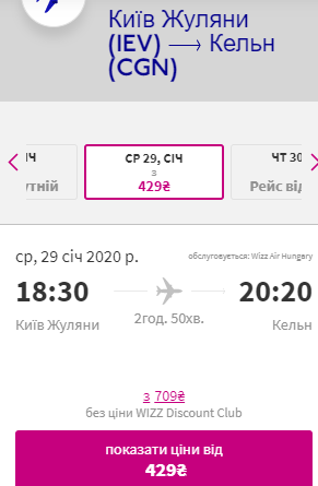 Київ — Кельн, 29 січня- 2 лютого — €41 для учасників wizz-клубу та €61 для всіх інших