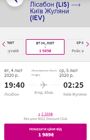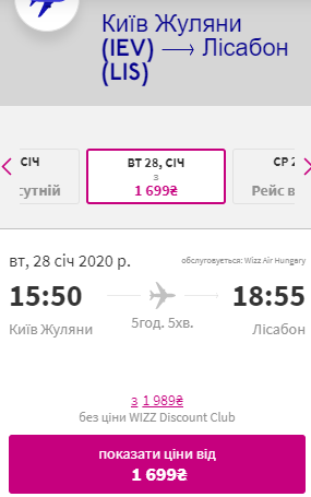 Київ — Лісабон, 28 січня-4 лютого — €124 для учасників wizz-клубу та €145 для всіх інших
