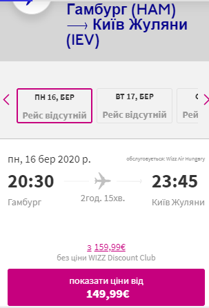 Дата: 16 березня. Авіакомпанія – Wizz Air. Ціна квитка в один бік – €150 для учасників wizz-клубу та €160 для всіх.