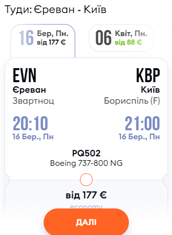 Дата: 16 березня. Авіакомпанія – Sky Up. Ціна квитка в один бік – €177