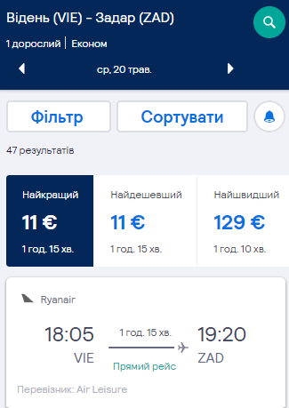 Дата: 20 травня. Авіакомпанія: Ryanair. Ціна квитка в один бік — €11 з особи.