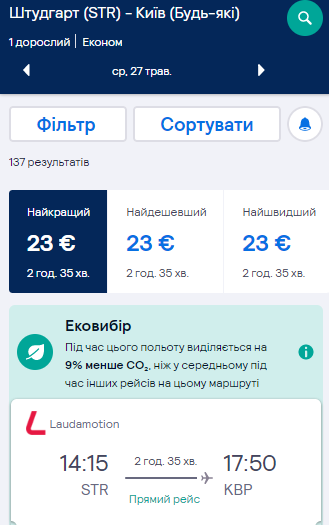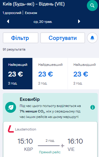 Дата: 20 травня. Авіакомпанія: Laudamotion. Ціна квитка в один бік — €23 з особи.
