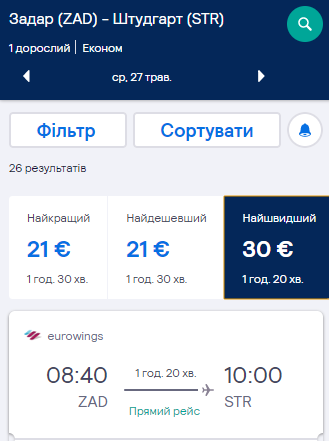 Дата: 27 травня. Авіакомпанія: Еurowings. Ціна квитка в один бік — €30 з особи.