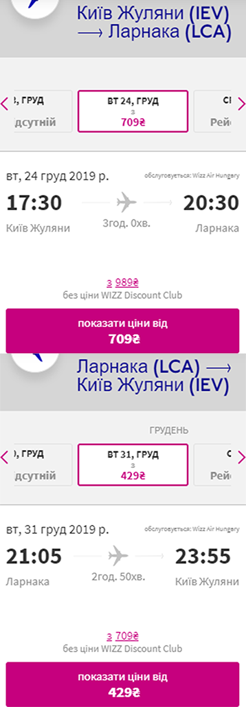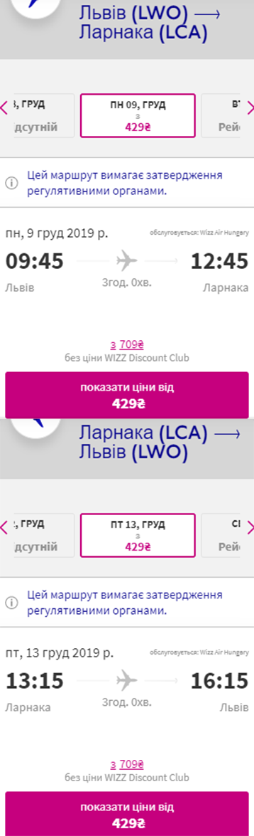 Дати – 9-13 грудня. Вартість квитків у два боки – €30 для учасників wizz-клубу та €50 для всіх інших.