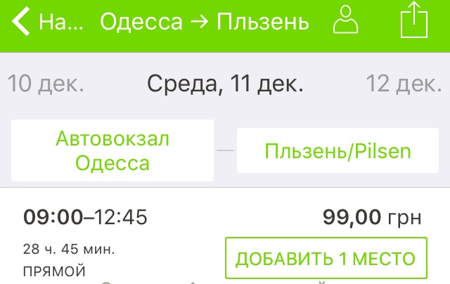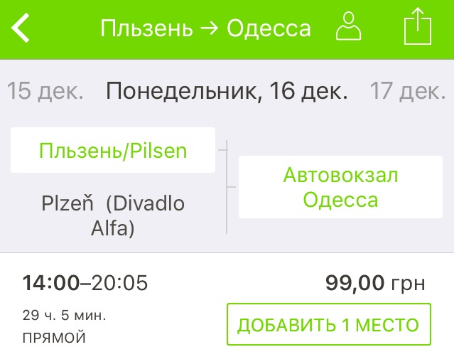 Рейс – Одеса – Пльзень та назад. Дати – 11-16 грудня. Ціна квитків у два боки – 198 грн.