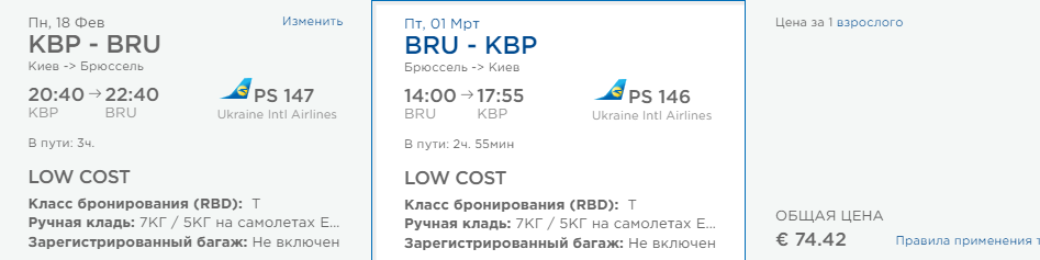 Київ – Брюссель 18.02-01.03- 74 євро (МАУ)