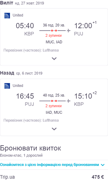 Зразок перельоту Київ – Пунта-Кана та назад авіакомпанії United (частково перевізник Lufthansa):