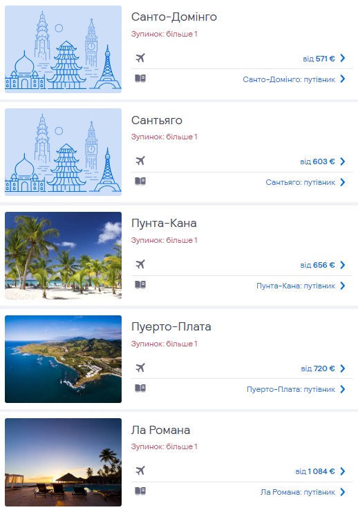 Пример минимальной стоимости билетов в две стороны с Киева в курортные города Доминиканы на одного пассажира (цены по состоянию на 08.11.19):