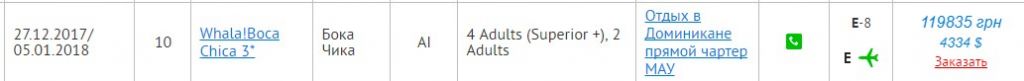 На новогодние даты 27 декабря 2017 г. по 17 января 2018 г. (в три этапа с 27 декабря по 05 января, с 05 по 17 января, с 17 по 26 января) организован прямой чартерный перелет МАУ на Доминикану. Перелет занимает 12 часов. Минимальна стоимость турпакета на 10 ночей по этой программе составляет от $1615 на человека. Итак, если хотите лететь «родной» авиакомпанией в компании украинских туристов – спрашивайте турпакет «под чартер». В этой программе – групповой трансфер, экскурсии.