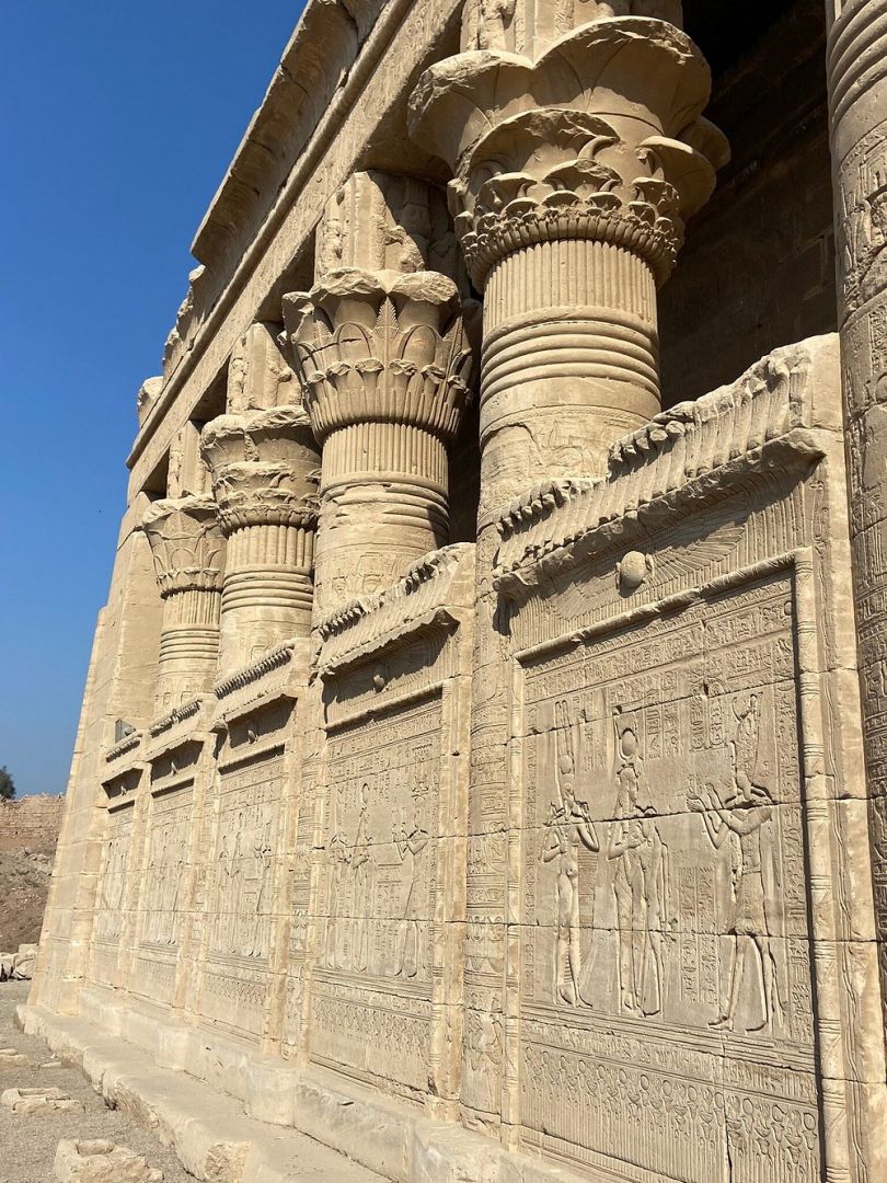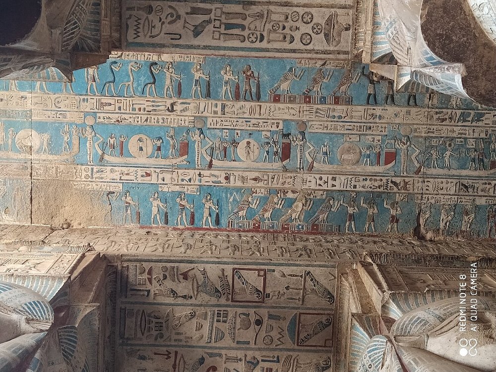 - Архітектурні особливості: Храм славиться своїми вишуканими рельєфами, що зображують різноманітні міфи та ритуали. Особливу увагу привертають зоряні карти на стелі, які свідчать про високий рівень астрономічних знань древніх єгиптян. Також вражають колони у вигляді папірусу та квіткових бутонів.