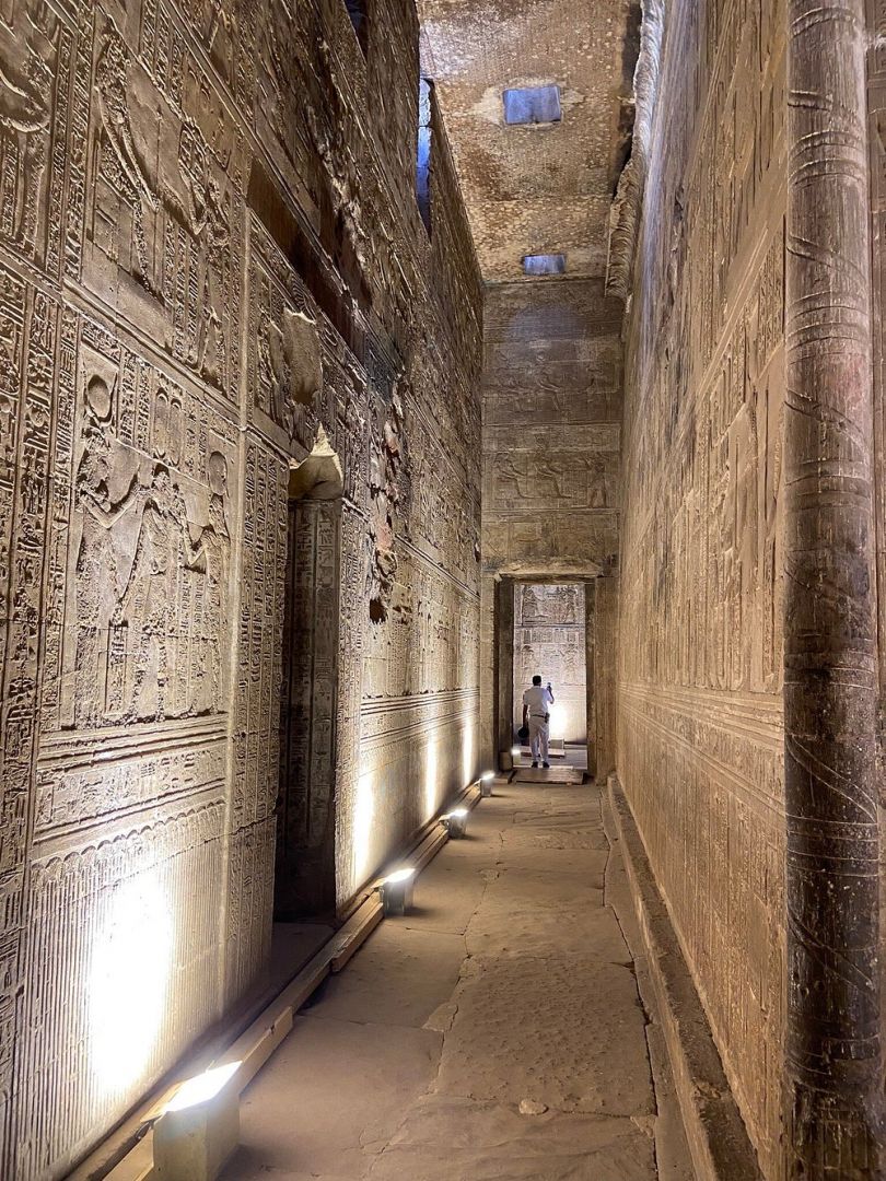 - Будівельні особливості: Храм побудований з високоякісного вапняку і граніту. Його стіни прикрашені яскравими розписами, які збереглися до наших днів завдяки сухому клімату Єгипту.