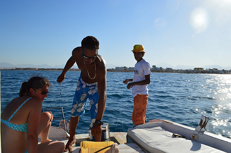 Рядом с вами обязательно будет стоять «смотрящий» – член экипажа кораблика, который будет вам менять наживку и снимать с крючка пойманную рыбу. Наживить кусок кальмара на крючок можете попробовать и сами, хотя это и не так просто, а вот снимать улов с крючка самим не рекомендуется. Вы можете поймать как безвредную рыбу, так и опасную. Предоставьте это тому, кто в рыбах разбирается лучше вас, и вы увидите, что часть пойманной рыбы пойдет в котел, часть будет выброшена за борт из-за несъедобности, а некоторых рыб египтяне будут даже снимать с крючка пинцетом или чем-то подобным.