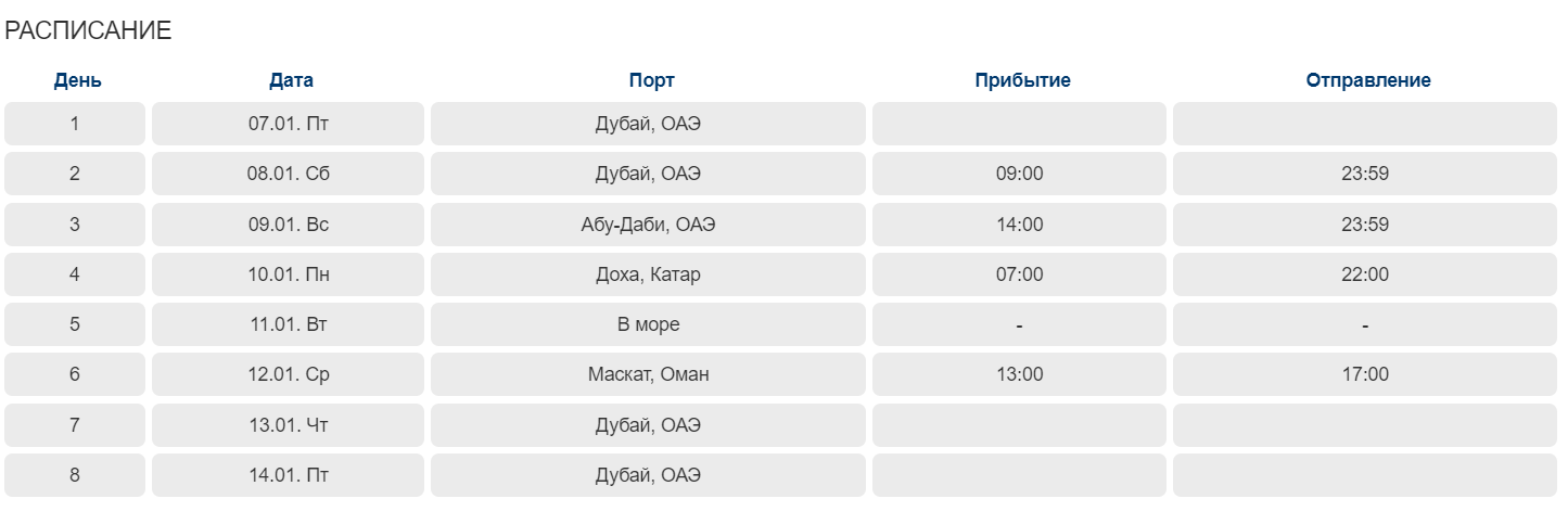 По маршруту лайнер посещает столицы ОАЭ и Катара, а также доставляет гостей в древний Маскат, что позволяет по достоинству оценить уникальность этого региона и посетить всемирно-известные места. Для того чтобы гости имели возможность оценить по достоинству регион, было полностью переработано портфолио и предложено гостям новые форматы русскоязычных экскурсий от круизной компании по сниженной цене.