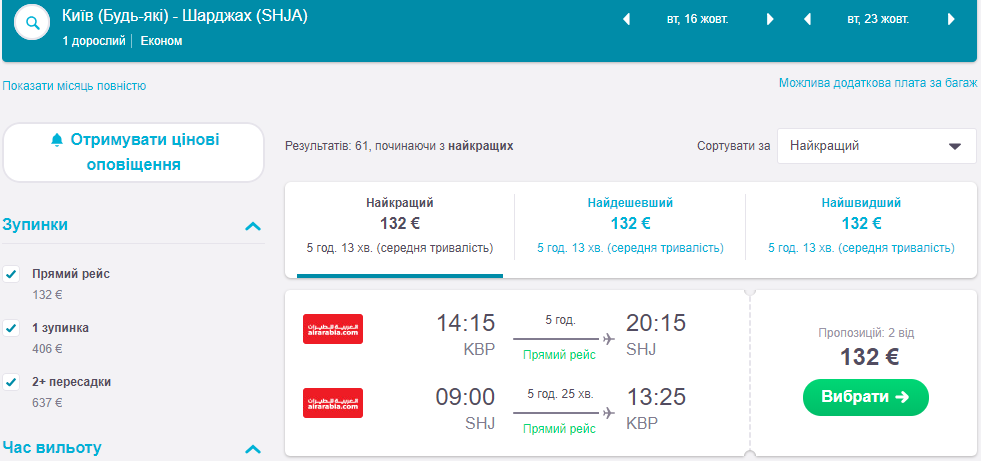 Air Arabia пропонує квитки прямий переліт “Київ – Шарджа” на 16-23 жовтня. Вартість: – 132 євро.