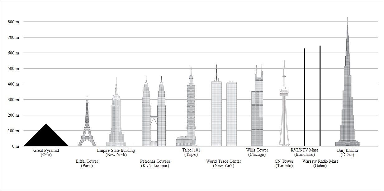 Найвища окрема (вільна) споруда: 829,8 м. (раніше Сіен Тауер, CN Tower Торонто, Канада) – 553,3 м.)