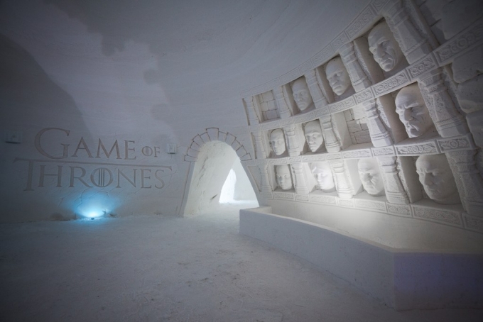 Lapland Hotel SnowVillage расположен недалеко от Хельсинки. Он оснащен железным троном, Залом ликов, скульптурами Дракона и Григора Клигана из льда. Сообщается, что скульптуры создавали мастера из Польши, Украины и Латвии.